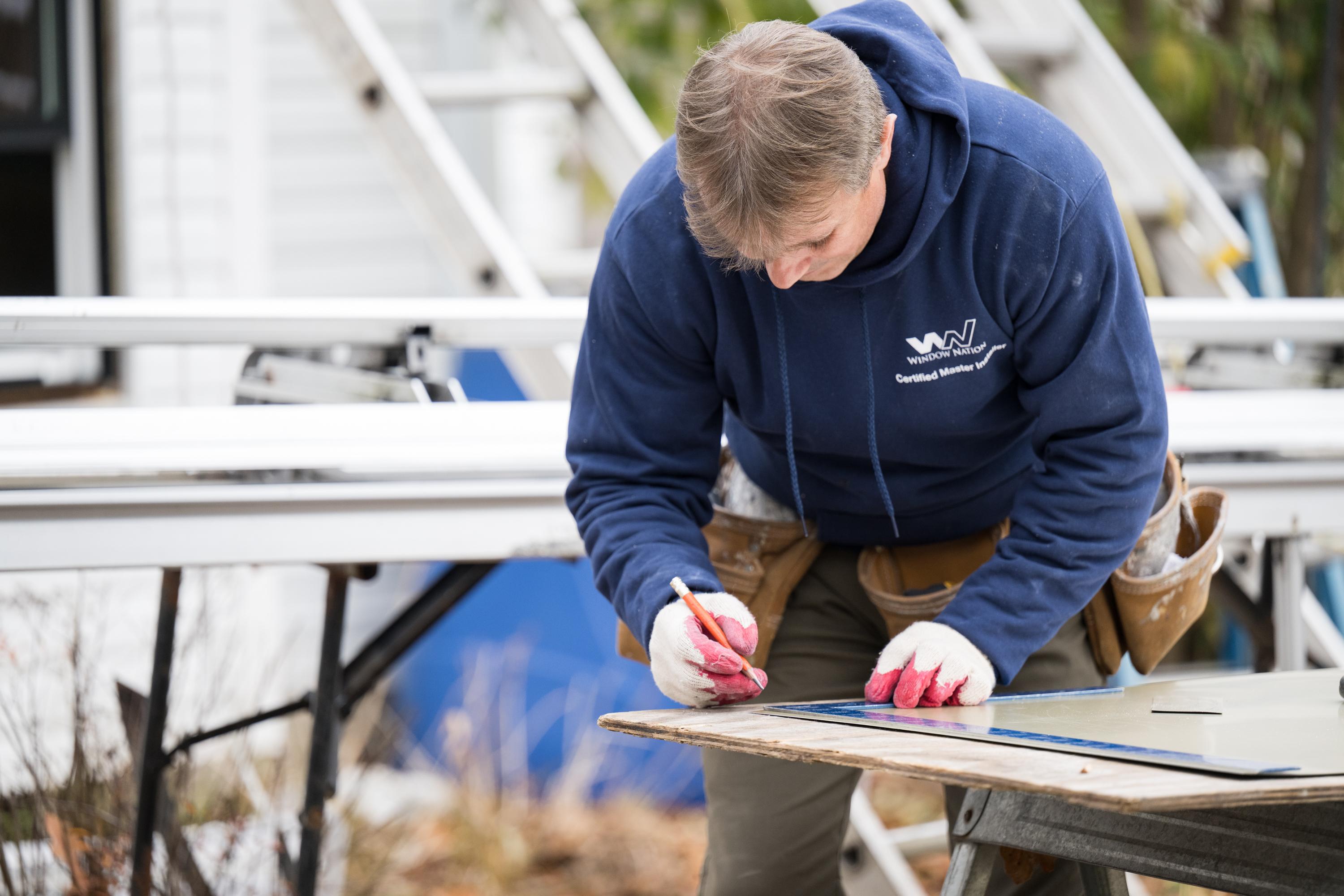Professional handyman installing window at home.